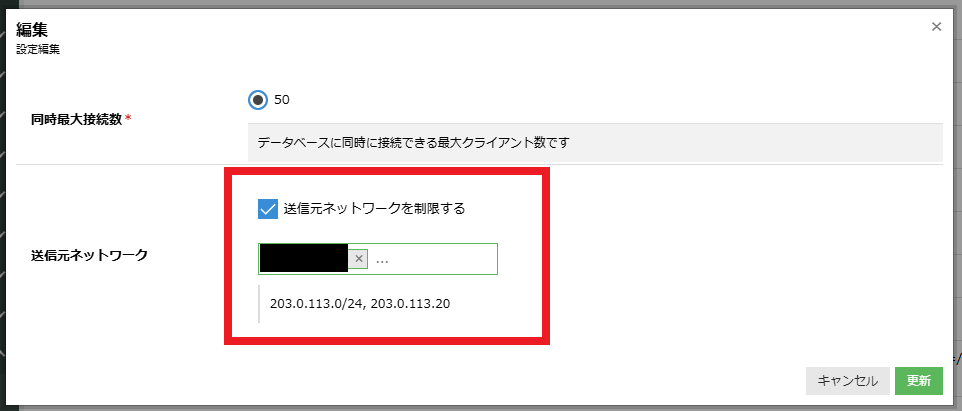 「データベースの変更」画面から、「送信元ネットワーク」は、利用するサーバーや信頼できるIPからのみアクセス可能な状態に変更をしておきましょう。