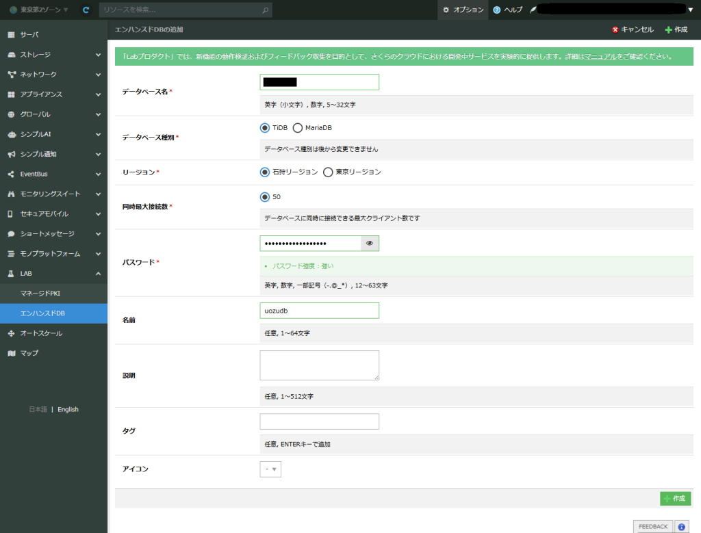 さくらのクラウドのエンハンスドデータベース(Lab)/オンデマンドデータベースですが、「Labプロダクト」として新機能の動作検証およびフィードバック収集を目的として提供されているサービスとなります。