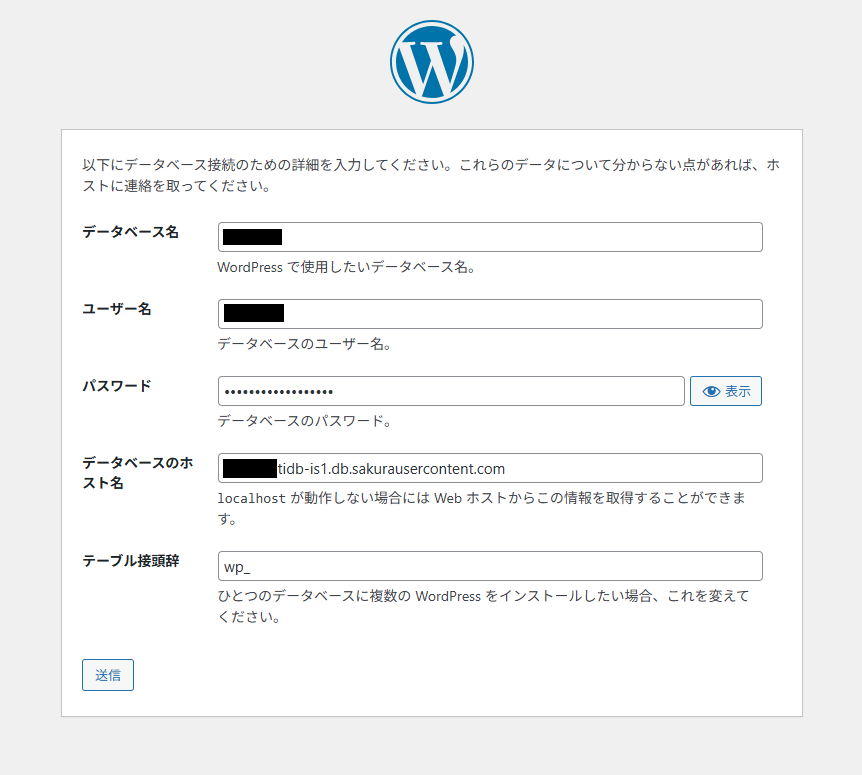 そのままデータベース名、データベースユーザー名、ホスト名を入力する事でインストールまでは簡単に出来ます。