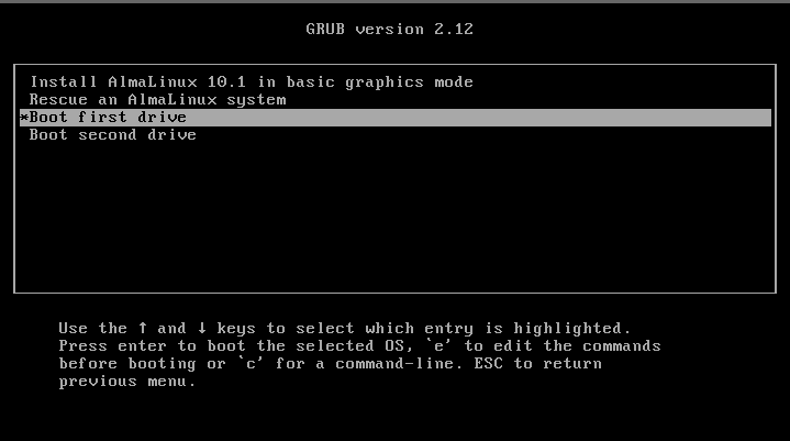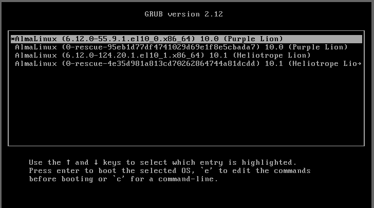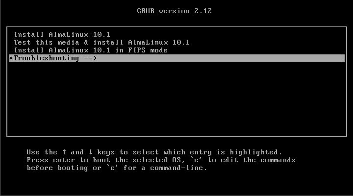 ISOイメージはAlmaLinux10を利用し、Troubleshooting を選択するまでは、公式のレスキュー手順通りに進めます。