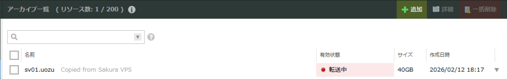 その後「転送中」の画面でVPSディスクのコピーが始まるので、完了するまでしばらく待ちます。