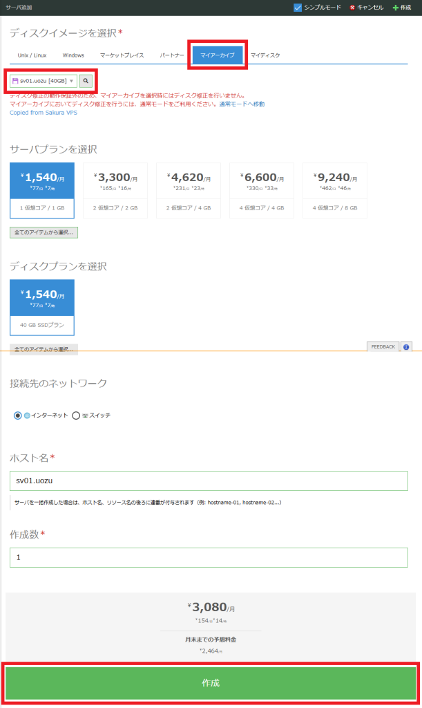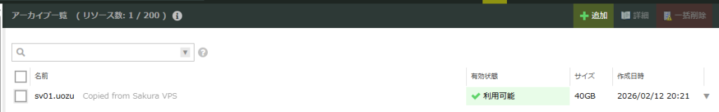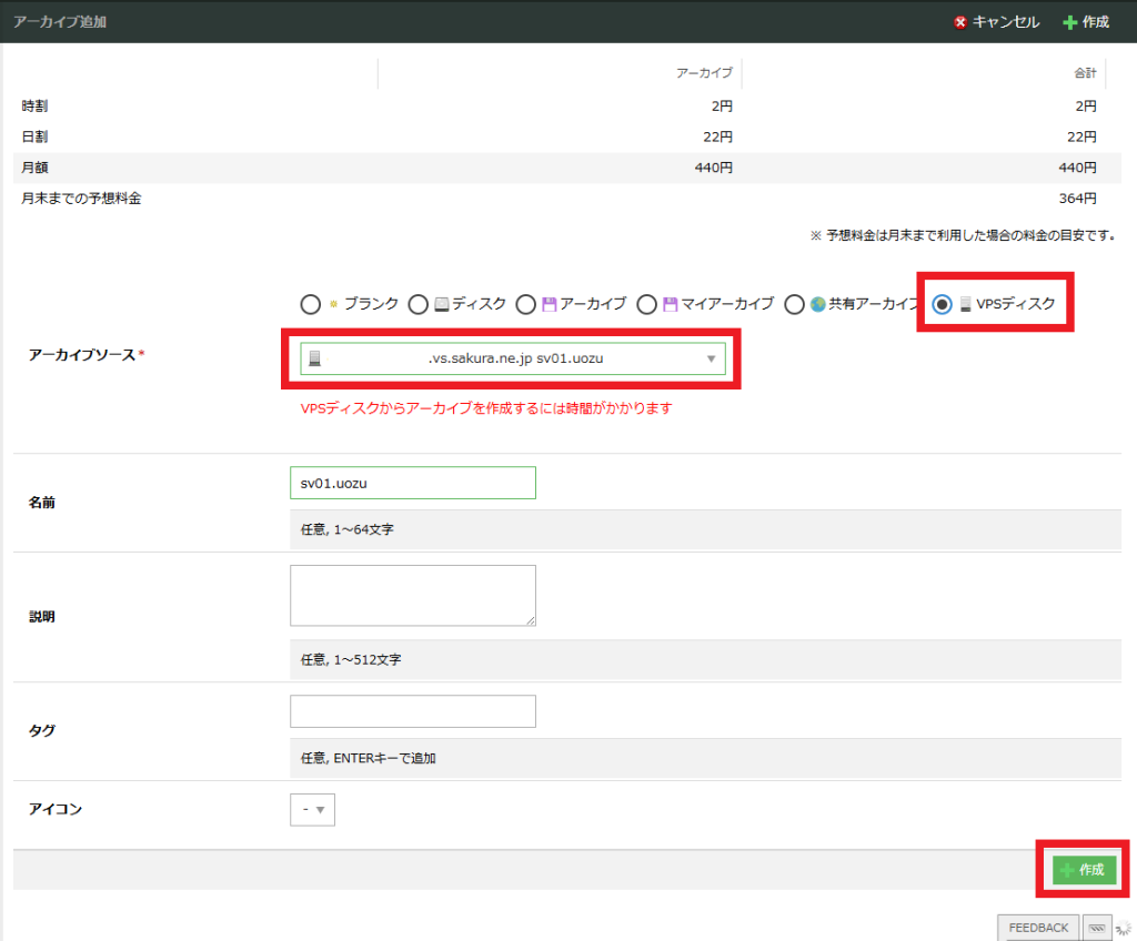 アーカイブソースは「VPSディスク」を選び、対象のサーバー(例:sv01.uozu)を指定し、作成ボタンを押してアーカイブを作成しましょう。