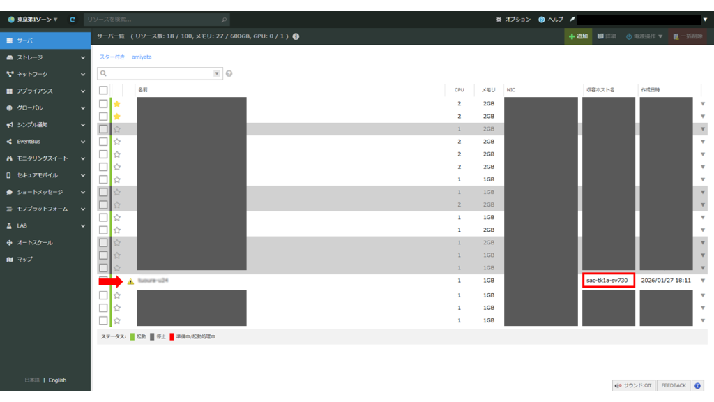 1つのアカウントで何台もサーバを起動させている場合、間違えないように気を付けましょう。