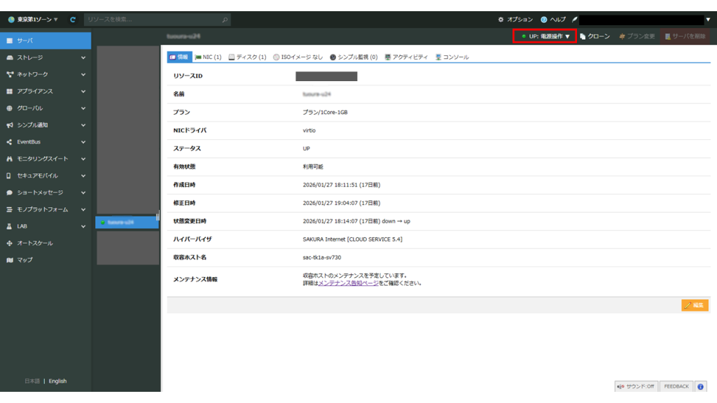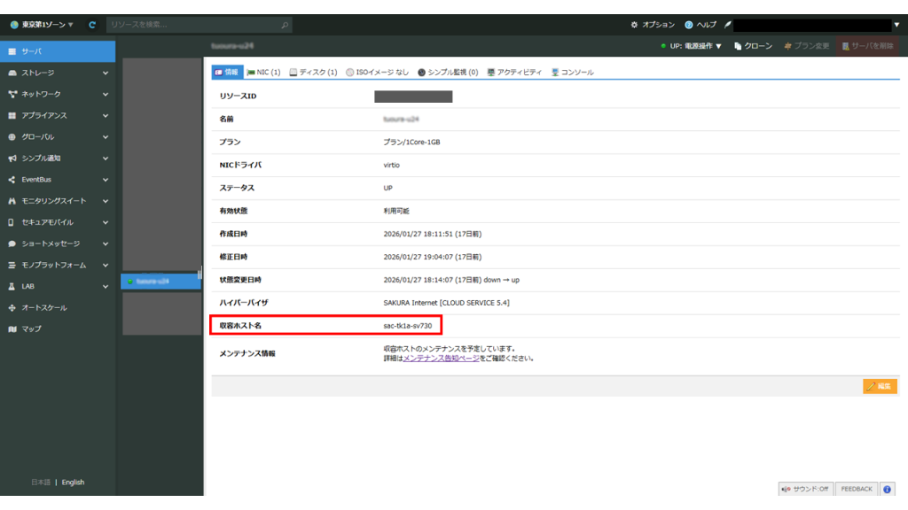 代わりに、メンテナンス情報に「収容ホストのメンテナンスを予定しています。詳細はメンテナンス告知ページをご確認ください。」という記載があります。