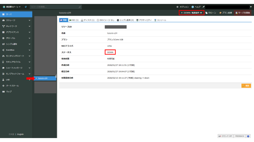 ステータスが「DOWN」になったこと、起動中には緑で光っていた部分がグレーになったことを確認します。