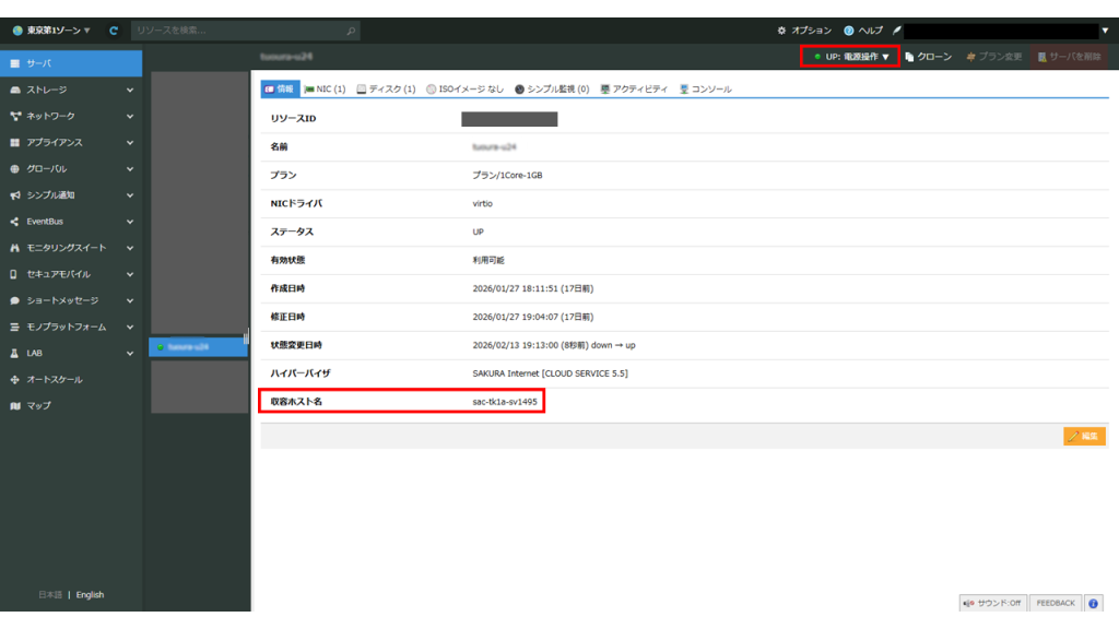 停止と同じく、サーバ詳細画面右上の [電源操作 ▼] から「起動」を選択します。