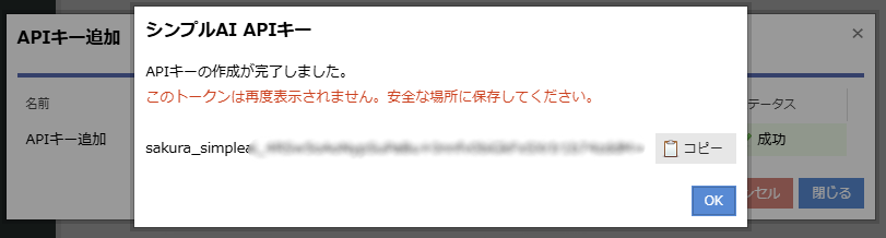 作成ボタンのクリック後、シンプルAI APIキーのトークンが発行されるので、メモしておきましょう。