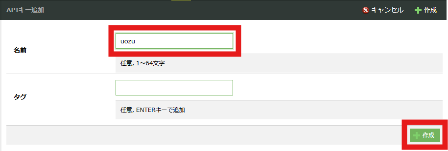 APIキーの追加画面に遷移するので、今度は名前を入力し、右下の「+作成」をクリックします。