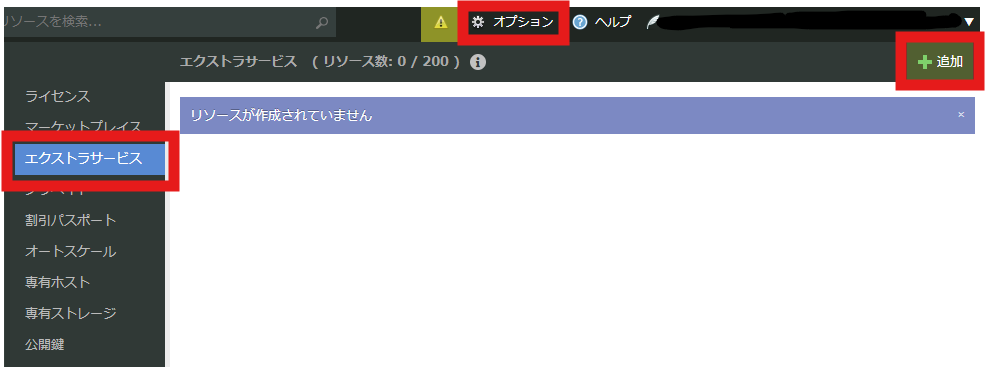 まずは、さくらのクラウドの各リージョンの画面から、画面右上の「オプション」、さらに左の「エクストラサービス」右上の「+追加」でエクストラサービスの追加画面に遷移します。