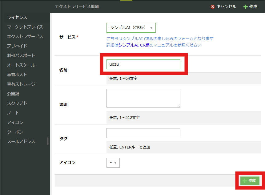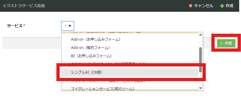 エクストラサービスの追加画面になったら、今度はプルダウンメニューから「シンプルAI CR版」を選択し、右の「+作成」をクリックします。
