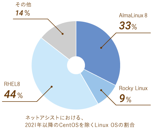 現状を知る上で、まずは弊社にて運用・保守させて頂いているサーバーを探ってみました。右図は、ネットアシストで運用・保守させて頂いているサーバーの内、CentOS 8のサポート終了宣言後に変更したLinux OSをピックアップし、割合をグラフ化したものです。