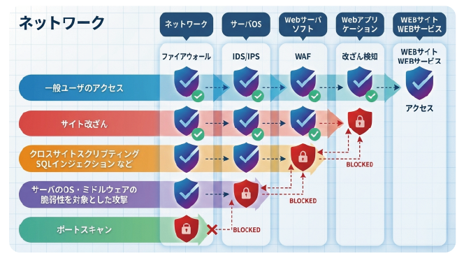 ファイアウォール(主にネットワークを保護)、IDS/IPS(主にOS/ミドルウェアを保護)、WAF(主にアプリケーションを保護)のようなセキュリティ製品の導入はお済でしょうか?
