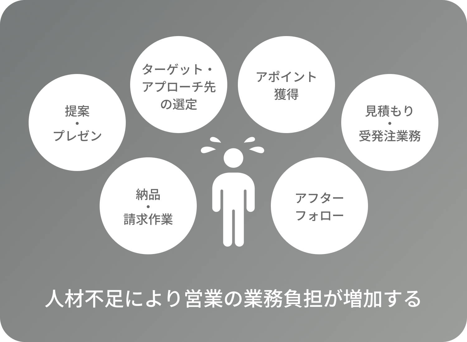 人材が不足すると、営業活動に割ける時間が著しく減少します。営業は売上アップに直結する重要な役割を担いますが、その業務内容は顧客との打ち合わせだけではありません。ターゲットやアプローチ先の選定に始まり、アポイントの獲得、提案やプレゼン、見積もりや受発注業務、納品や請求作業、アフターフォローまで多岐にわたる業務が含まれています。