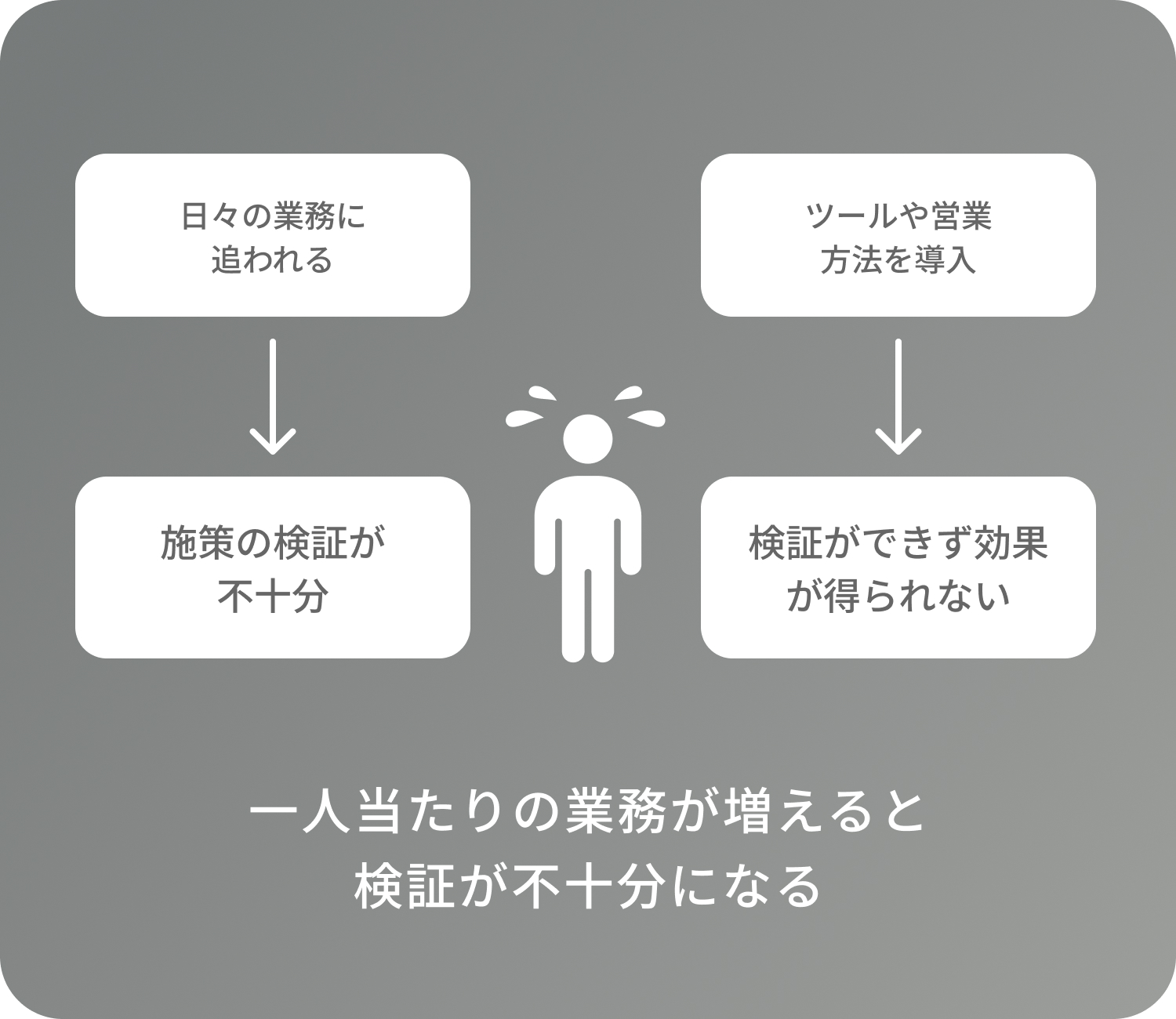 新しいツールや営業方法を導入した際にも、その効果を測定し改善するための分析が不十分となり、期待した成果が得られないことがあります。このような課題が続くと、施策の精度が低下し、組織全体の成長や収益向上を妨げる可能性があります。