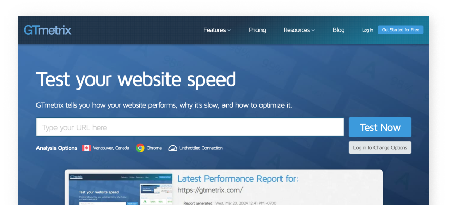 GTmetrixは、Webサイトの表示速度を測定し、パフォーマンスに関する詳細なレポートを提供してくれるツールです。パフォーマンスの改善点を把握したい場合に有効です。