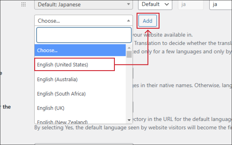 すると、プルダウンメニューにさまざまな言語の選択肢が表示されます。今回は英語対応を行うため、「English (United States)」を選択してください。