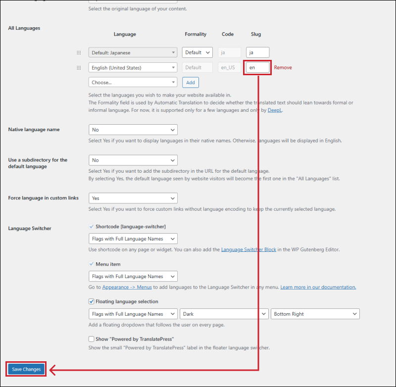 これで準備が整いましたので、「Save Changes」ボタンを押して設定を保存してください。この「en」という文字列は、英語ページのURLを示します。この場合、URLは「[WordPressのサイトURL]/en/」となります。