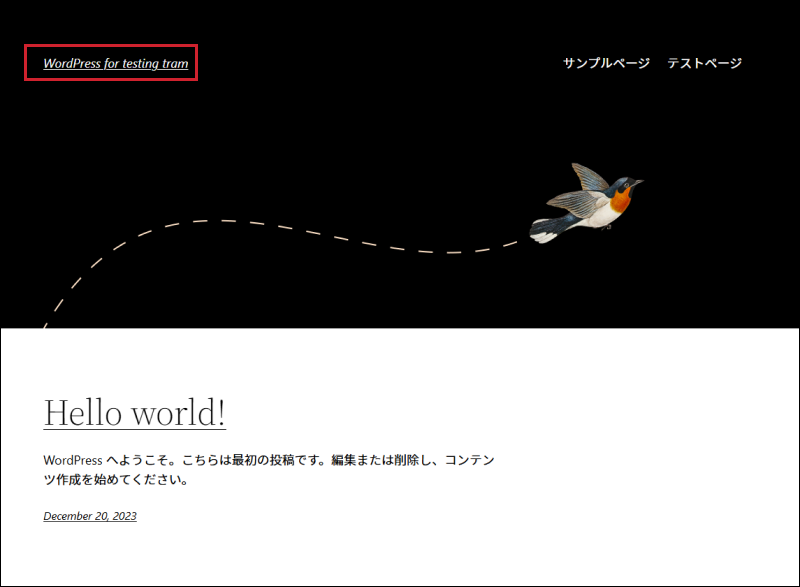切り替えが完了したら、先ほど翻訳して保存したサイト名の部分を確認してください。上記キャプチャの赤丸部分が翻訳された内容になっているはずです。