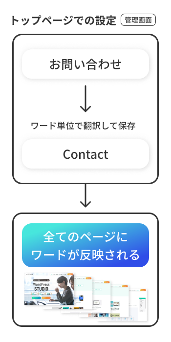 例えば、トップページで「お問い合わせ」というテキストを「Contact」に翻訳して保存し、その後に別のページで「お問い合わせ」というテキストがあれば、既に翻訳された状態となります。
