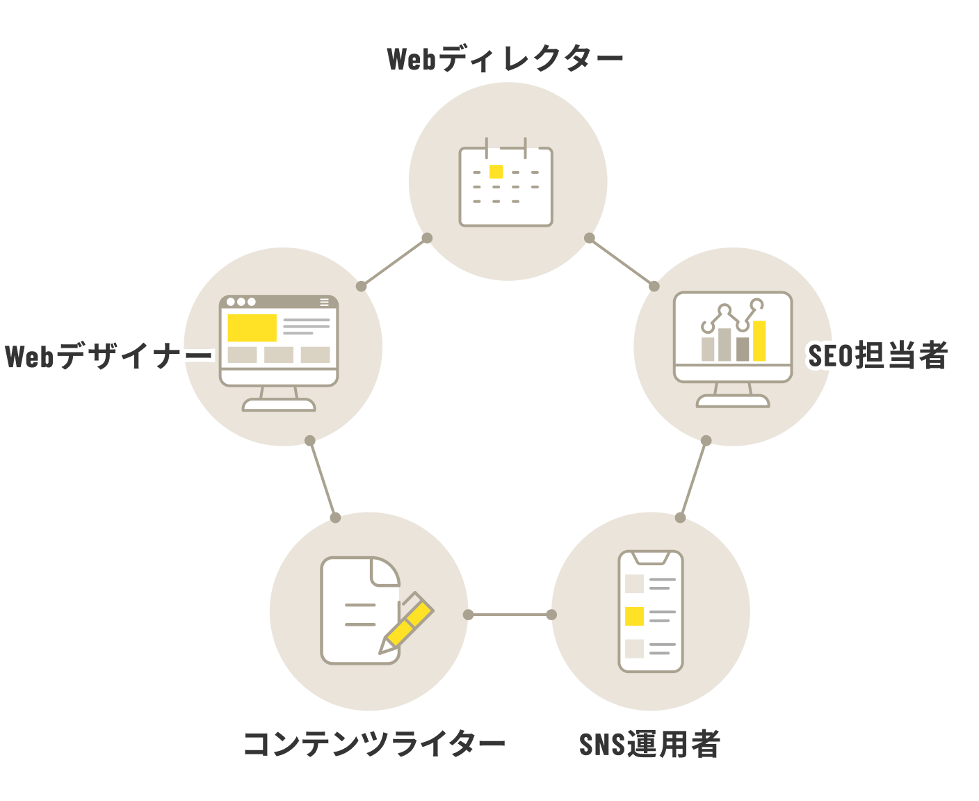 ホームページ運営に必要な視点を把握できても、適切なスキルを保有した人材を配置しないと運営することは難しいです。ここからは、ホームページ運営に求められる人材「SEO担当者」「Webディレクター」「Webデザイナー」「コンテンツライター」「SNS運用者」の5つの見出しで紹介します。