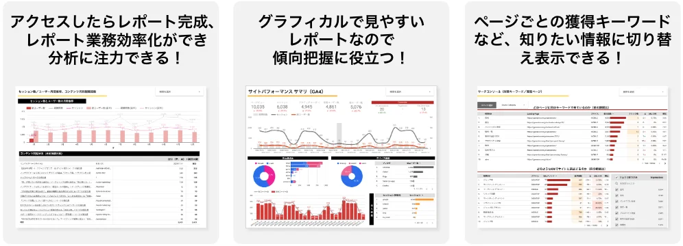 アクセス解析で期待した効果を出すためには、正確なレポートの作成と分析が必要不可欠ですが、本サービスを導入することで人為的なミスのないレポート作成を実現できます。