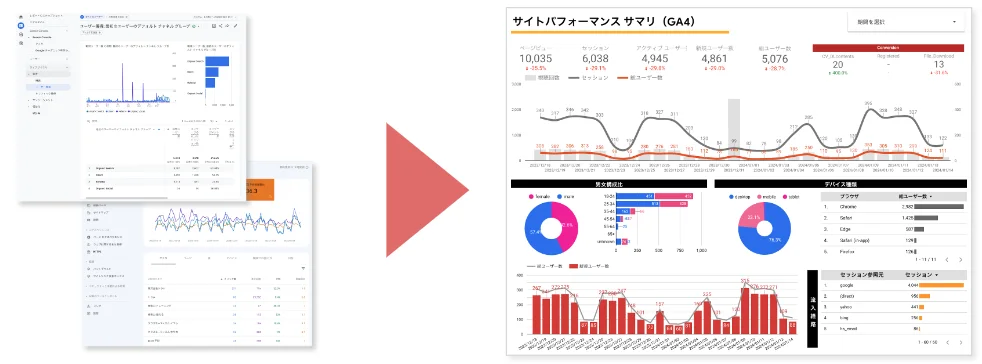 本サービスでは、GA4やサーチコンソールなどのアクセスレポートを自動化するだけでなく、顧客行動をグラフや図表を用いてより分かりやすいレポートを自動で作成いたします。