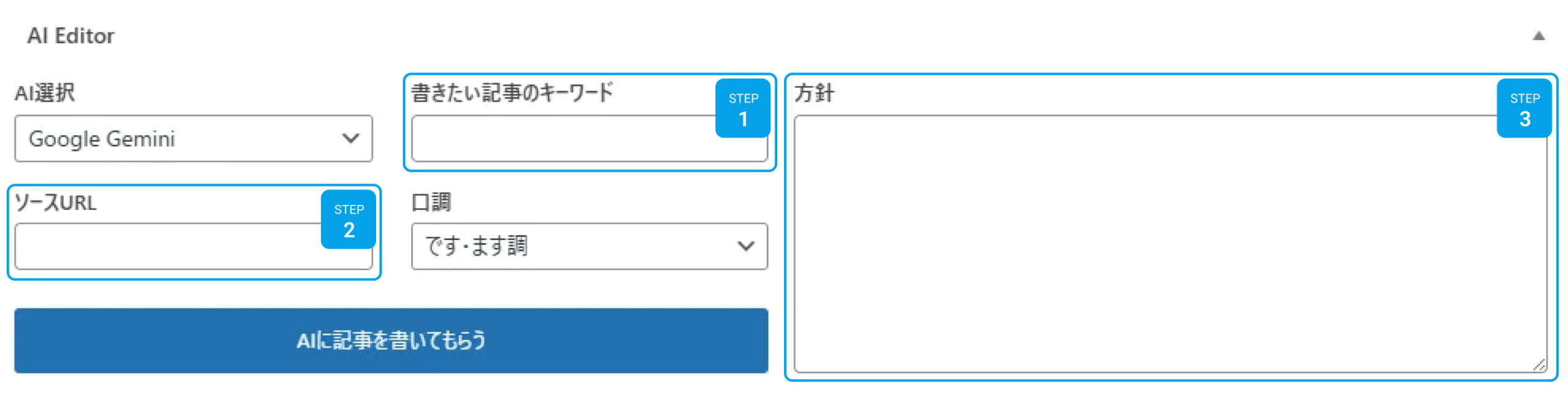 3つの必要情報を入力し「AIに記事を書いてもらう」をクリックします。
