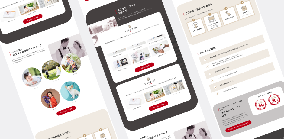 当サービスサイトでは、フォトアルバムやフォトグッズなど、写真を扱う商品を提供しているため、写真の美しさを損なわないよう、大きく魅力的に見えるデザインを心がけています。