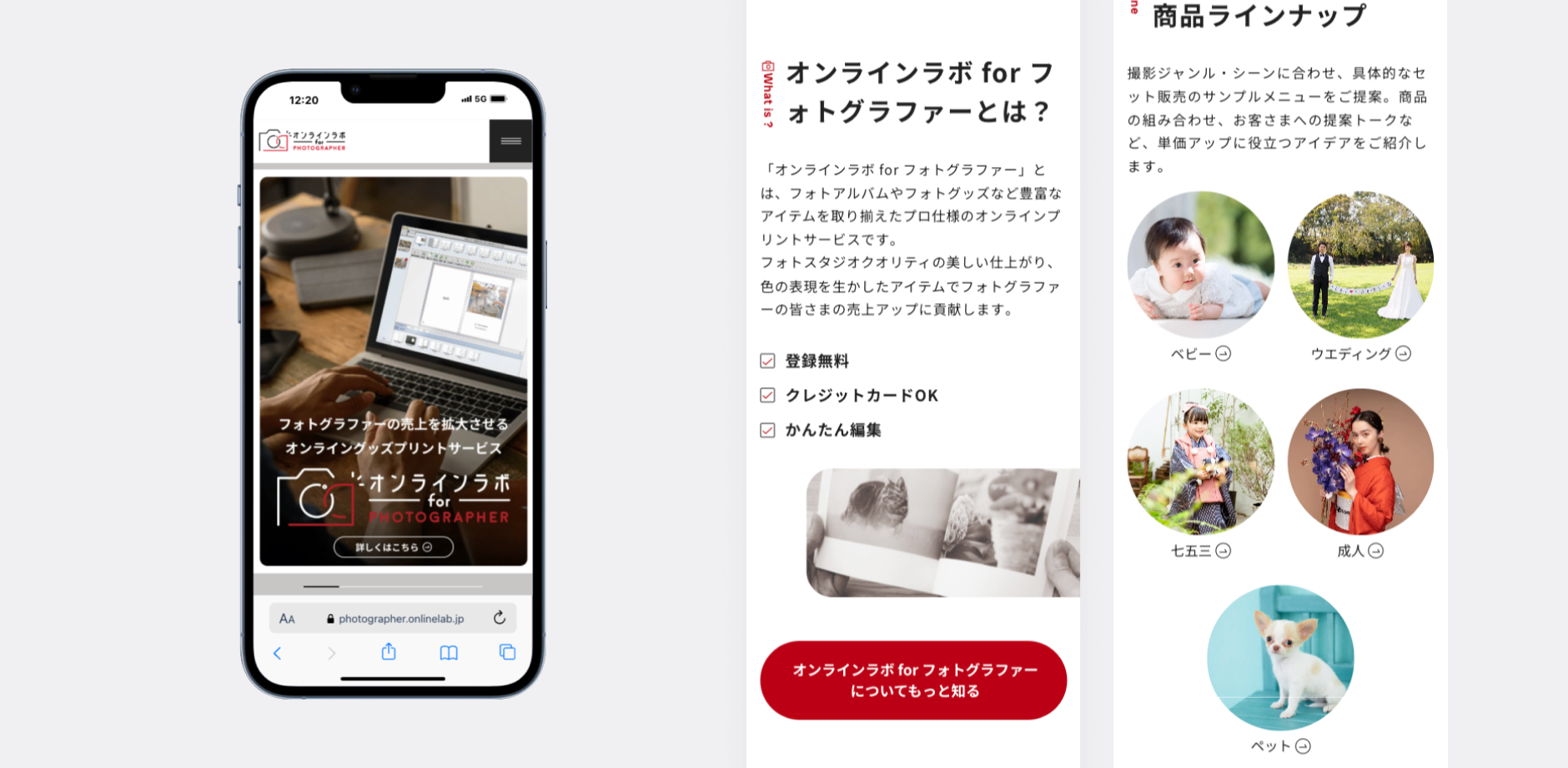 株式会社ラボネットワーク様のサービスサイト「オンラインラボforフォトグラファー」の制作を行いました。