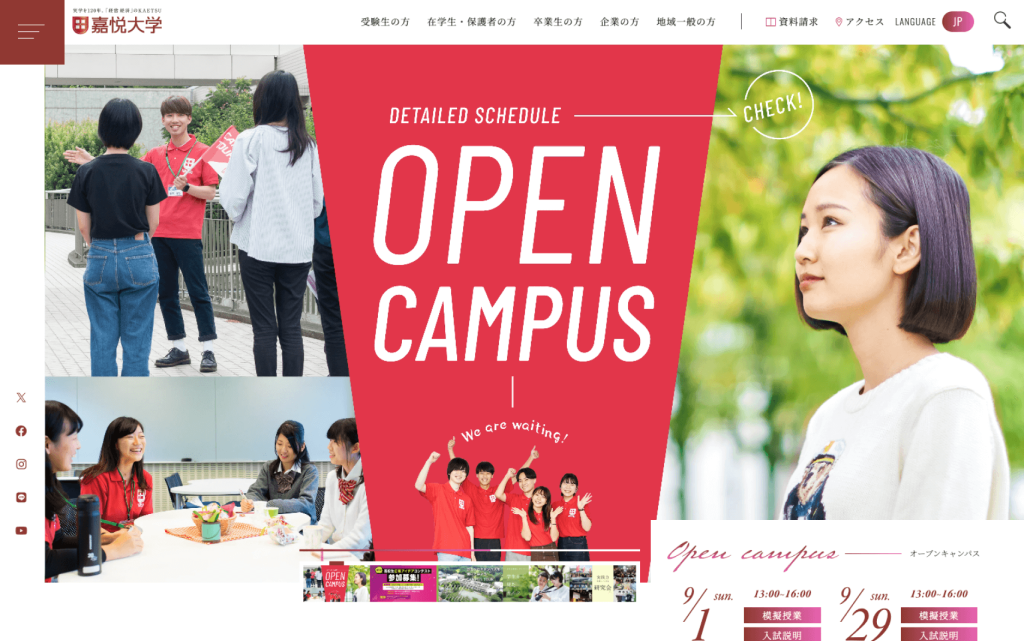 サイト内で利用されている多くの写真は、一部の写真を除き弊社で撮影しました。大学の特長の1つに「自然あふれた学校」があるため、写真は空や緑の写真を多く取り入れ、また学校生活の楽しさを感じてもらえるものを採用しました。