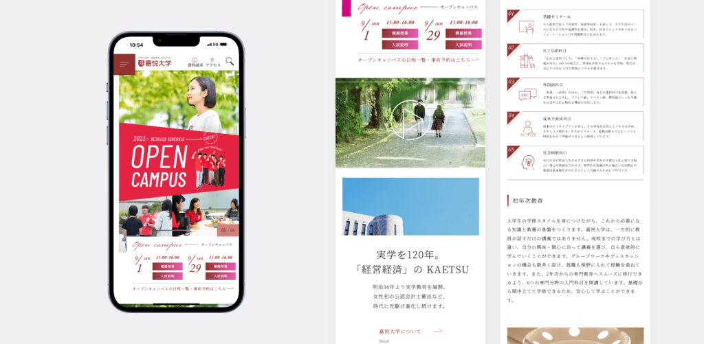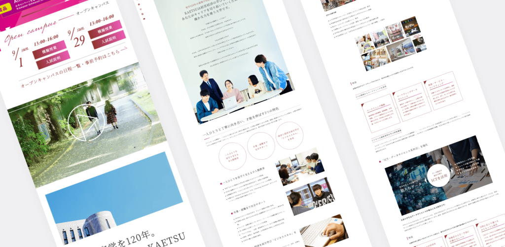 デザインは、今後は「女子学生も増やしていきたい」というご要望をいただいていたので、フォントは明朝体を使用し聡明で女性的なイメージを持たせ、「シンプル × スタイリッシュ」をコンセプトに各コンテンツが目立つ装いに仕上げました。