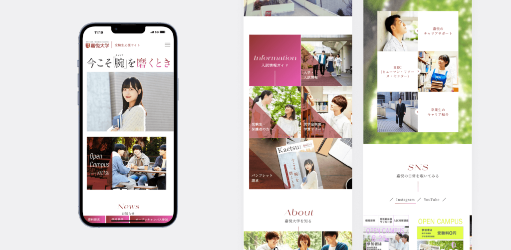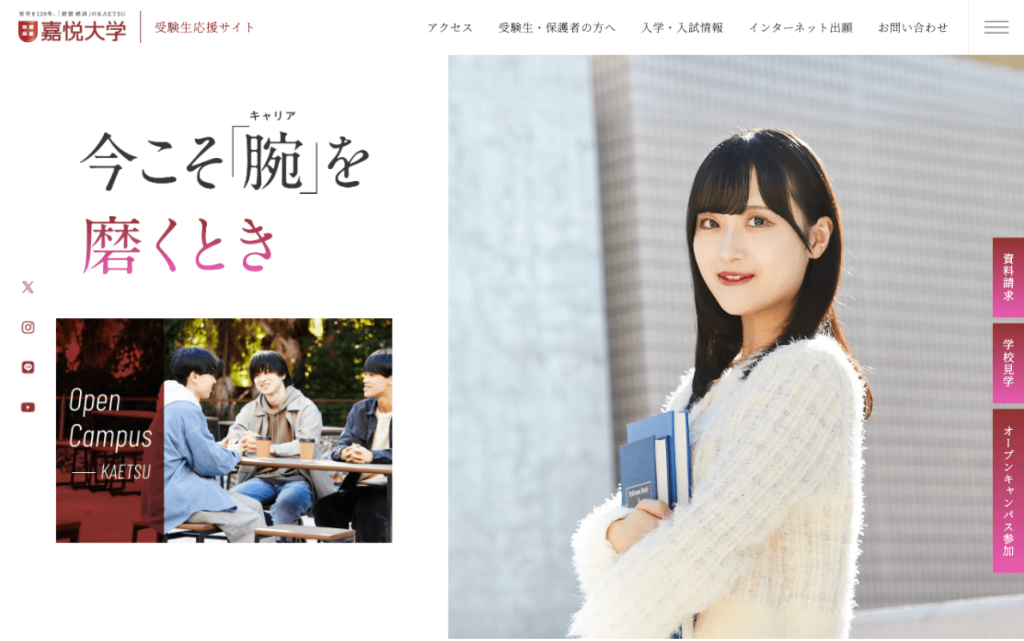 入試カレンダーは、年間を通してどのような受験があるのかを一覧で確認することができます。1日のスケジュールでは、先輩(在学中の学生)のキャンパスライフを紹介し、実際に嘉悦大学へ入学した場合はどのような日常が待っているのかを想像できるコンテンツを設けています。この他、SNS投稿画像が表示できるエリアを設け、大学の魅力や日常を受験生にアピールできるようにしました。