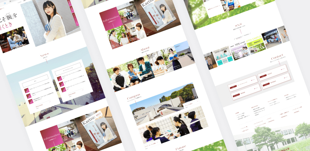大学の本サイトを閲覧していない方でも「大学のイメージ」が伝わるよう、連動性を意識しトンマナを近づける形でデザインしました。また受験生や保護者の方に「楽しいキャンパスライフ」を想像してもらえるよう、笑顔の写真を多く取り入れました。